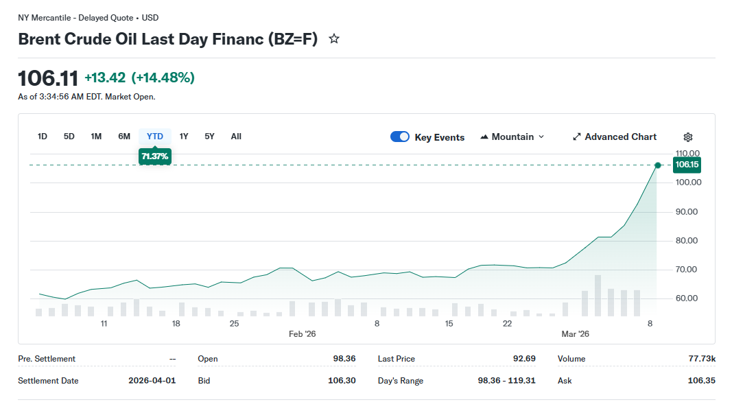 A határidős piacokon már érezni lehetett vasárnap este is, hogy valami nincs rendben, de hétfő reggelre mind a Brent, mind a WTI olaj árfolyama egyaránt 110 dollár fölé ugrott, ami 20-25%-os napi ugrásnak feleltethető meg a pénteki záráshoz képest. A kereskedők szerint ez egyike lehet azoknak a napoknak, melyekre évtizedek múlva is egyértelműen emlékezni fogunk, hiszen a vasárnapi olajár-sokk húszmillió hordós napi kieső kínálathoz, és több mint kétbillió dollárnyi elpárolgó részvényértékhez vezetett. Mindeközben a Hormuzi-szoros kapcsán továbbra is nagy a pánik, miután a világ olajszállítmányának mintegy ötöde itt halad át, azonban a forgalom gyakorlatilag leállt, a tankerhajók pedig kivárnak.