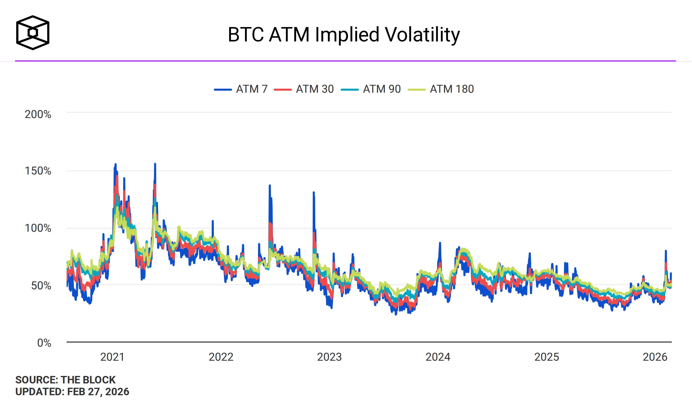 Bitcoin implied volatility görbe: rövid távú inverzió (1 hetes ATM IV ~60%) jelzi a fennmaradó bizonytalanságot a visszapattanás ellenére. Forrás: The Block