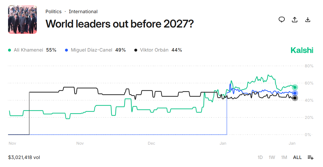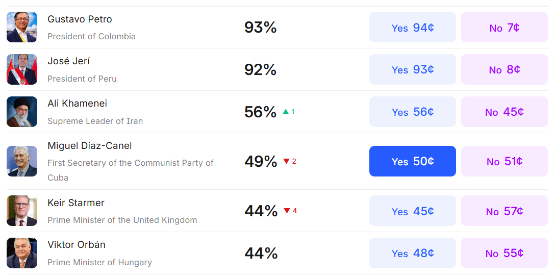 A listát 93% és 92%-os valószínűséggel Gustavo Petri kolumbiai és José Jerí perui elnök vezeti, akik az idei választásokon valószínűleg veszíteni fognak országukban leginkább a gazdasági problémák és a megélhetési nehézségek miatt. De a rendkívül széleskörű tüntetésekkel szembesülő és azokat véres kézzel elfojtó iráni vezető, Ali Hámenei távozása is jó eséllyel bír, az ő távozására 56%-os valószínűséget jósolnak a fogadók az év vége előtt. Mögötte szintén nem meglepő módon a Donald Trump célkeresztjébe kerülő Kuba vezetője, a Kubai Kommunista Párt főtitkára, Miguel Díaz-Canel áll 49%-kal. A piac szerint tehát nagyjából fele‑fele esély van arra, hogy a politikus távozik, tehát ez nem a szavazatok aránya, hanem a piaci konszenzus szerinti valószínűség.