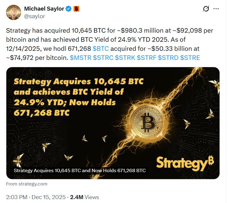 Azok után, hogy az előző héten a Strategy 10624 BTC-t vásárolt, összesen kb. 963 millió dollárért, átlagosan 90615 USD/BTC áron, december 15-én a cég bejelentette, hogy újabb, jelentős összegért vett coinokat. A tőzsdén jegyzett Strategy az Amerikai Értékpapír- és Tőzsdefelügyelethez (SEC) benyújtott dokumentum szerint most 10645 Bitcoin-t vásárolt, 980,3 millió dollár értékben, átlagosan 92098 dollárt adva egy coinért. Összességében így a vállalat már 671268 BTC-vel rendelkezik, amelyet összesen körülbelül 50,33 milliárd dollárért szerzett meg, ami 74972 dolláros átlagárat jelent coinonként.
