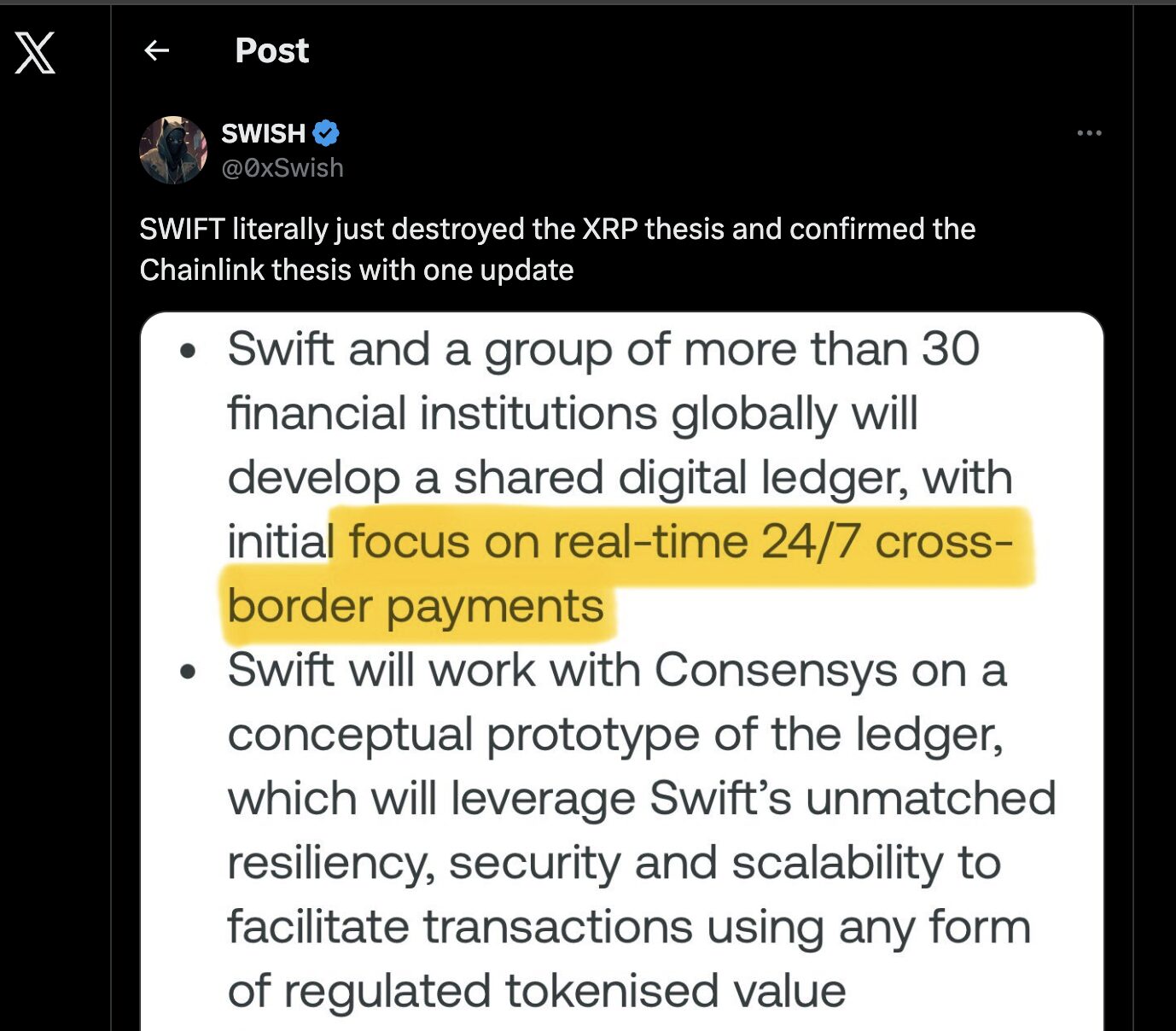 - Egy másik kommentátor hozzátette, hogy a SWIFT lépése „szó szerint lerombolta az XRP tézist.”