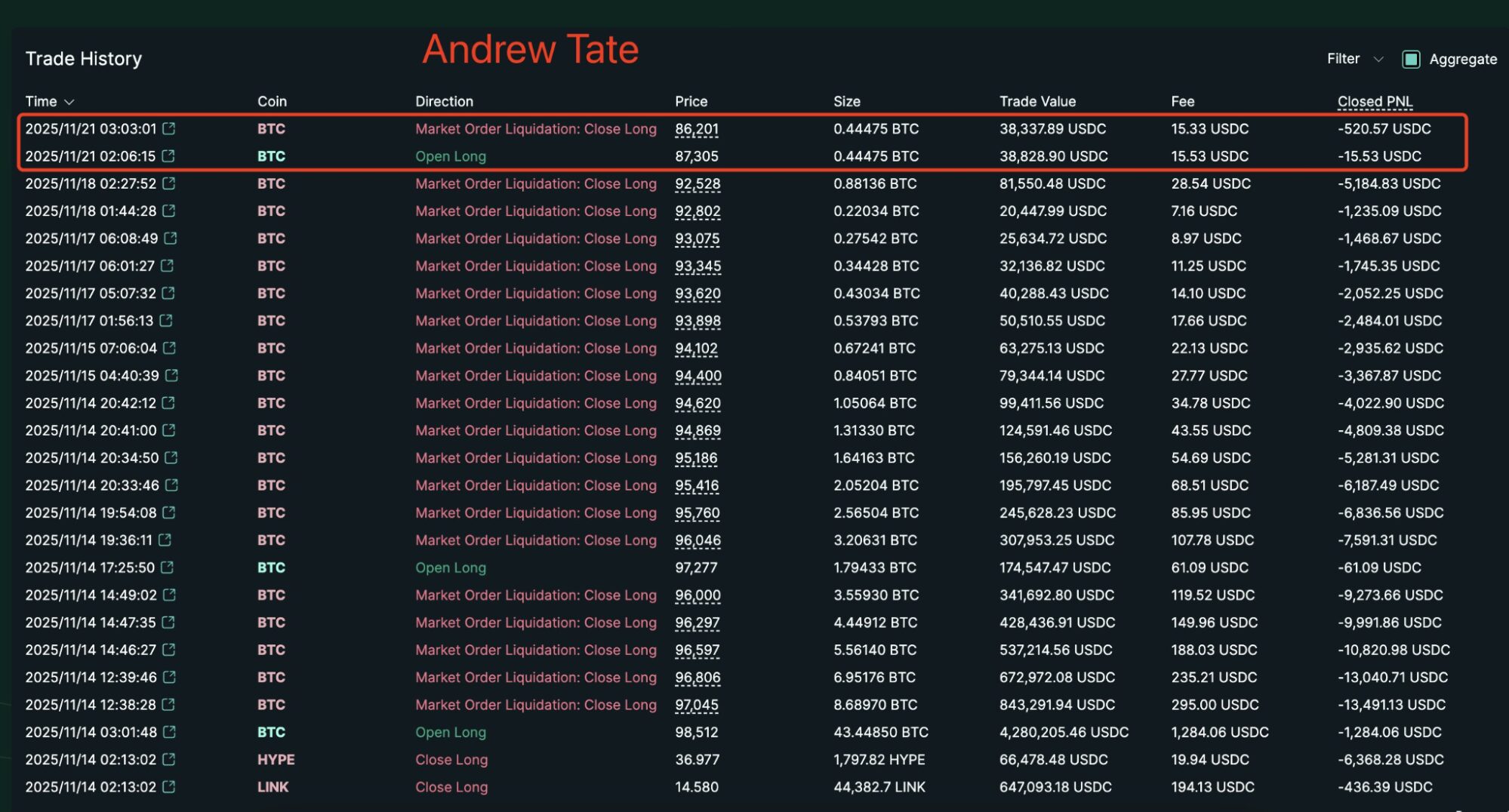 A legnagyobb visszhangot Andrew Tate okozta, akit a Lookonchain szerint immár 84. alkalommal likvidáltak a Hyperliquid tőzsdén. Tate hetek óta sorozatos veszteségeket könyvel el, és a mostani összeomlás tovább növelte a veszteségszériáját.