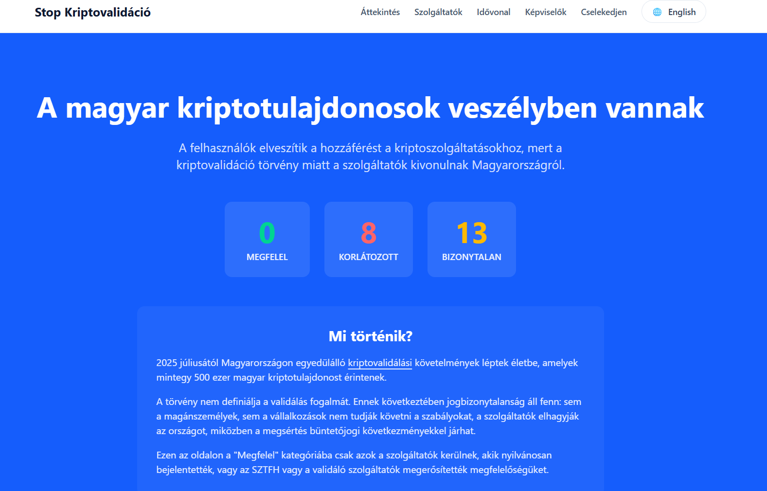 Miközben a technológia világszerte a decentralizációról és a saját pénzünk feletti kontrollról szól, itthon egy kétséges jogi konstrukció korlátozza a piacot és veszélyezteti a szolgáltatások elérhetőségét. A Stop Kriptovalidáció célja, hogy erre a helyzetre ráirányítsa a figyelmet, és végső soron egy átláthatóbb szabályozási környezetet érjen el a magyar kriptósok számára.
