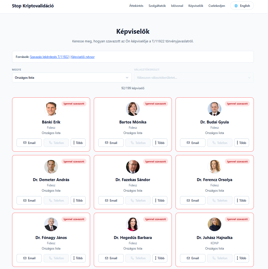 Itt jön azonban a Stop Kriptovalidáció újdonsága, hiszen az oldal nem csak tájékoztat, hanem cselekvésre is ösztönöz. Ugyanis a portálon a felhasználók saját körzetük alapján kikereshetik, hogy az országgyűlési képviselőik hogyan szavaztak a jogszabály benyújtása után. Nem meglepő, hogy a kormánypárt teljes mellszélességgel beállt a törvény mögé, és megszavazták a jogszabályt. Az oldal egy előre megírt üzenetet is megfogalmazott, amelyet akárki átmásolhat a saját emailjébe, és elküldheti a a parlamenti képviselőjének tiltakozásul.