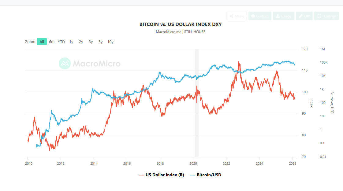 A dollárindex egy olyan mutató, amely az amerikai dollár értékét méri hat másik jelentősebb valuta (euró, japán jen, brit font, kanadai dollár, svéd korona és svájci frank) ellenében. Az index célja, hogy megmutassa, mennyire erős vagy gyenge a dollár a nemzetközi valutapiacon. A bitcoin árfolyammozgása régóta fordítottan korrelál a DXY indexével. Történelmileg, amikor a DXY erősödik, a BTC hajlamos csökkenni, míg a csökkenő DXY gyakran kedvező makrogazdasági feltételeket teremt a bitcoin árfolyamának emelkedéséhez. Most viszont az látható, hogy a DXY csökkenésével a BTC ára szintén csökkenést mutat.