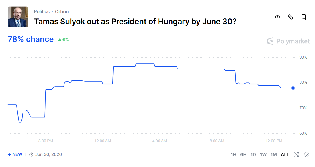 A Polymarket fogadói azonban most ismét Magyarország felé fordulnak, és az egyik leglényegesebb kérdésben alkotnak véleményt, saját tőkéjükkel alátámasztva: mi lesz Sulyok Tamás köztársasági elnök sorsa? A fogadás ugyan még csak ma indult el, azonban a felhasználók közel 80%-a úgy látja, Sulyok elhagyja hivatalát június végéig. Utánajártunk, mivel járhat ez!