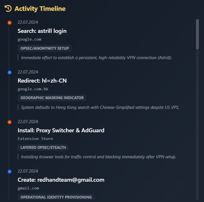 A felhasználó az Astrill VPN segítségével egy amerikai IP-címen keresztül irányította a forgalmat, de a böngésző beállításai alapértelmezés szerint egyszerűsített kínai nyelvre voltak állítva, és a fordítási előzmények között közvetlen koreai nyelvű lekérdezések is szerepeltek. A rendszeren Slack, Telegram, Dropbox és BeeBEEP alkalmazások is megtalálhatók voltak, amelyek mind a belső kommunikációra, mind a potenciális parancs- és vezérlőfunkciókra utalnak. Különösen a Dropbox mappaszerkezetei utaltak arra, hogy a lopott adatokat későbbi hozzáférés céljából töltötték fel. Az már korábban többször is megerősített információként látott napvilágot, hogy az észak-koreai hackerek az Astrill VPN-t használják IP-címük elrejtésére. A fertőzött gépen látható volt az is, hogy újabb akciók voltak folyamatban, mert például az érintettek megvásárolták a callapp.us és a callservice.us domainneveket, valamint olyan aldomainneveket is, mint a zoom.callapp.us. Ezeket valószínűleg arra használták, hogy rávegyék a célpontokat hamis szoftverek vagy frissítések letöltésére.