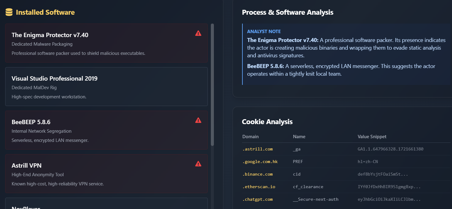 A fertőzött eszköz egy csúcskategóriás konfiguráció volt, 12. generációs Intel Core i7 processzorral, 16 GB RAM-mal, olyan fejlesztői eszközökkel, mint a Visual Studio Professional 2019 és az Enigma Protector. Ez egy szoftvervédelmi és licencelési eszköz, amelyet Windows‑os programokhoz használnak. Célja, hogy megakadályozza a programok feltörését, visszafejtését vagy jogosulatlan használatát. A program egy részét saját virtuális CPU‑ban futtatja, így a kód gyakorlatilag elemezhetetlen és megvédi az .exe, .dll, .scr, .ocx és .NET futtatható fájlokat a visszafejtéstől. Biztos, hogy nem csak egy lelkes fiatal programozótanoncról van szó. Nagyon erős konfiguráció és nagyon profi programok álltak a támadók rendelkezésére.