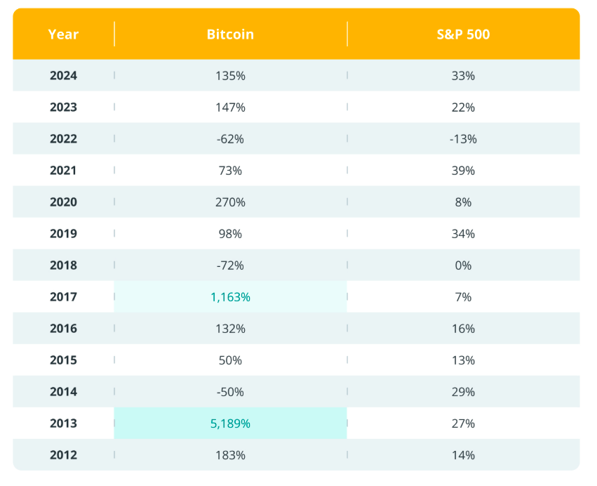 Az S&P 500-hoz képest a Bitcoin teljesítménye kivételesen magasabb volt, amint az az alábbi táblázatból látható: