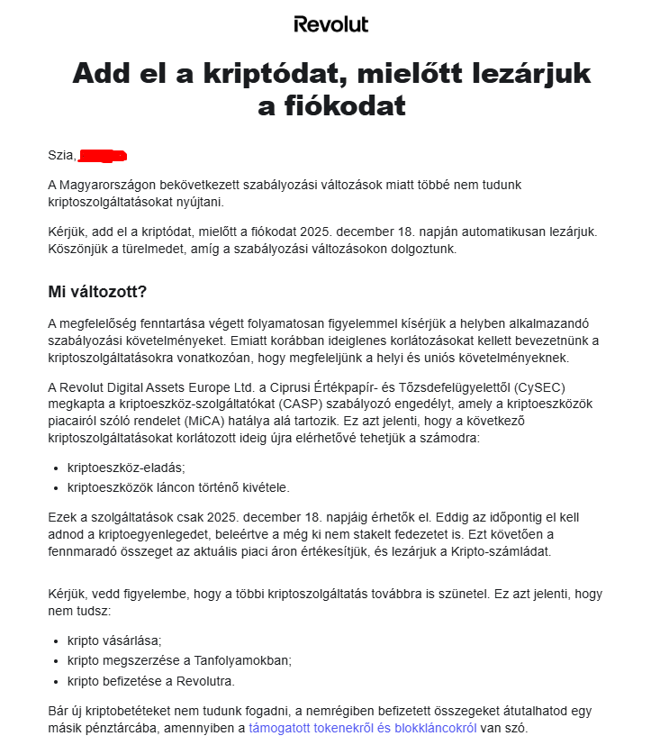A Revolut nemrégiben tájékoztatta a hazai ügyfeleket emailben, hogy 2025. december 18-án teljesen megszünteti lakossági kriptovaluta-szolgáltatásait Magyarországon. Addig kizárólag eladni lehet a bent ragadt tokeneket, illetve a támogatott érméket kiutalni külső tárcába; új kriptovalutát venni, jutalomként szerezni vagy a számlára utalni már nem engedélyezett. A jelenleg stakelt egyenlegek december 10-én kerülnek leállításra automatikusan, a lezárást követően pedig a rendszer a maradék pozíciókat piaci áron értékesíti, a zsebeket pedig megszünteti. Aki nem lép időben, annak a döntést a platform hozza meg helyette – gyakorlatilag kényszerlikvidálással.
