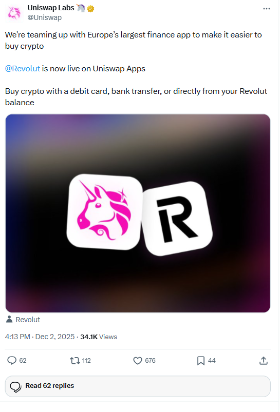 Az Uniswap Labs bevezetett egy új funkciót, amely lehetővé teszi a felhasználók számára, hogy közvetlenül a Revoluttal fizessenek a kriptovásárlásokért. Ez az integráció mind a mobil alkalmazást, mind a webalkalmazást támogatja, zökkenőmentes élményt kínálva a támogatott régiók felhasználóinak.