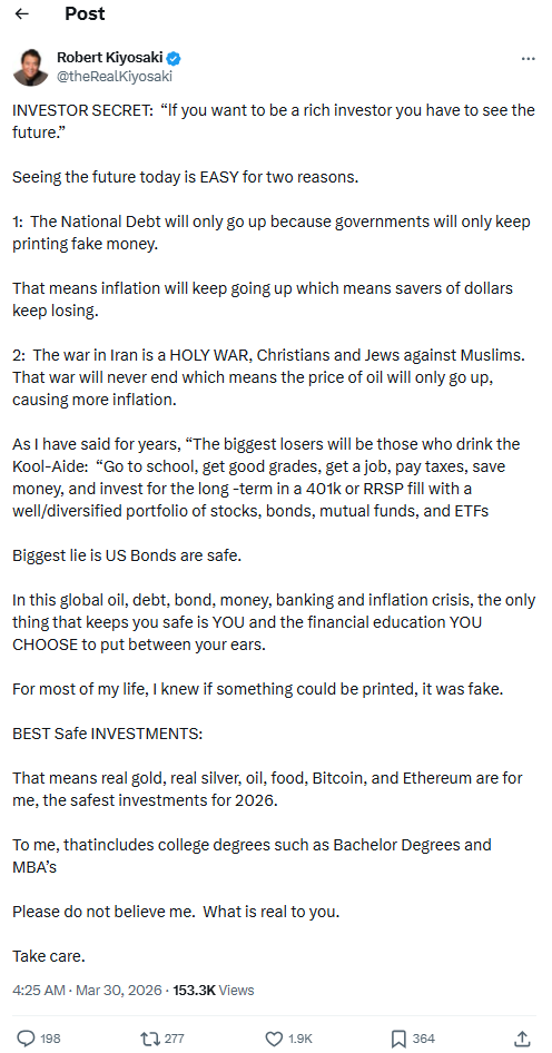 Ezenkívül Robert Kiyosaki becslése szerint egy másik tényező, amely márciusban a piacokat igencsak mozgatta, szintén itt marad: az iráni háború. Konkrétan „SZENT HÁBORÚNAK” nevezte a konfliktust, és úgy becsülte, hogy az „soha nem fog véget érni”, ami azt jelenti, hogy az olajárak értelemben tovább fognak emelkedni.