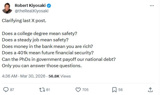 Valójában Robert Kiyosaki ebben egy sor kérdést tett fel olyan dolgok előnyeivel kapcsolatban, mint az egyetemi oktatás vagy a nyugdíjalapok. A befektető ezután azzal zárta a bejegyzést, hogy követőinek elmondta, hogy csak ők tudják saját maguknak megválaszolni a feltett kérdéseket.