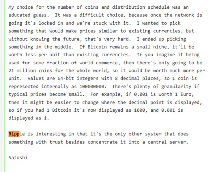 „A Ripple érdekes abban, hogy ez az egyetlen másik rendszer, amely a bizalommal valamit máshogyan csinál, mint hogy azt egy központi szerverbe koncentrálná.” – tulajdonítják Satoshinak egy 2009-es emailben