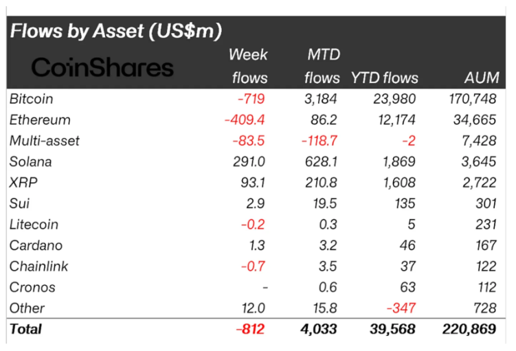 (SOL) szintén kiemelkedik most a legtöbb altcoin közül, amelyeket érdemes most figyelni. Az elmúlt héten 291 millió dolláros tőkebeáramlást regisztrált, így a havi összértéke már 628 millió dollár, az éves tőkebeáramlás pedig eléri az 1,86 milliárd dollárt. A Solana-alapok (ETP-k) jelenleg 3,64 milliárd dollárt kezelnek, ezzel meghaladják az XRP hasonló mutatóit.