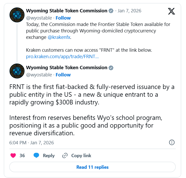 Wyoming amerikai állam elindította a Frontier Stable Tokent (FRNT – Határvidék stabilcoin, utalva Wyoming vadnyugati múltjára), így az első állam lett, amely fiat valutával 100%-ban fedezett stabilcoint bocsát ki. A helyi hatóságok nagyon optimisták a stabilcoin potenciálját illetően és bíznak benne, hogy segít csökkenteni a fizetési költségeket, javítja az átláthatóságot és bevételt generál az állami büdzsé számára. Ez a stabilcoin már nem csak terv, megvásárolható a Krakenen, és natívan a Solana hálózatán kerül kibocsátásra. A bevezetés jelentős lépés Wyoming hosszú távú céljának elérésében, amely szerint az ország legkriptobarátabb állama szeretne lenni.