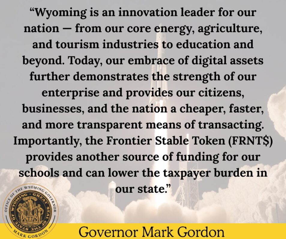 Mark Gordon, Wyoming kormányzója mutatta be az FRNT tokent, és részleteket osztott meg arról, hogy miért csökkentheti a tranzakciós költségeket és hogyan növelheti a bevételeket az állam számára. A tájékoztatás szerint a token mögött álló tartalékból – amely amerikai dollárból és rövid lejáratú amerikai kincstárjegyből áll – elért kamatokat visszakapja az állam. A pénzből aztán az oktatást és más közszolgáltatásokat támogatnának.