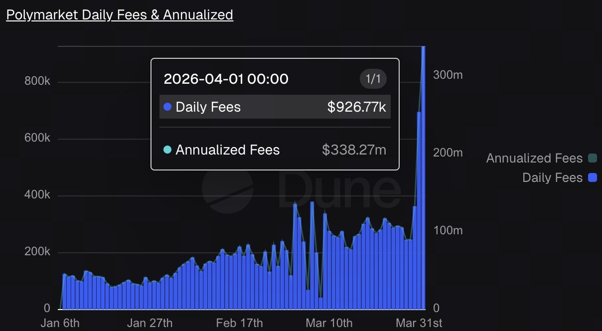 Van még egy másik adat is, amelyre a piacnak figyelnie kell: a platform díjak. A DeFi Oasis szerint a Polymarket napi díjbevételei április 1-jén körülbelül 927 000 dollárt tettek ki, ami éves szinten körülbelül 338 millió dolláros bevételt jelenthet, és a közeljövőben akár napi 1 millió dollár feletti díjbevételek is lehetségesek.
