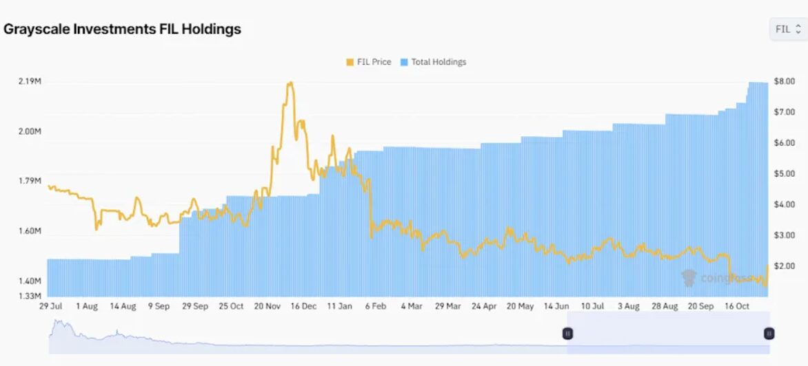 Ez két dolognak is köszönhető. Egyrészt a befektetők egyre inkább kedvelik azokat a projekteket, amelyek több cikluson át fennmaradtak és gyakorlati alkalmazási lehetőségekkel rendelkeznek. Ez a tendencia magyarázza az olyan altcoinok, mint a Zcash (ZEC), a Dash (DASH) és az Internet Computer (ICP) közelmúltbeli árfolyam-emelkedését. Másrészt az emelkedés a Grayscale tevékenységének is köszönhető. A Grayscale Investments az egyik legnagyobb kriptoalap a világon az elmúlt két évben folyamatosan halmozta fel a FIL coinját. Novemberben a birtokában lévő coinok száma minden idők legmagasabb szintjét, több mint 2,2 milliót ért el. Érdekes módon a Grayscale akkor is tovább növelte FIL pozícióját, amikor a token ára 10 dollár feletti szintről 2 dollár alá esett.