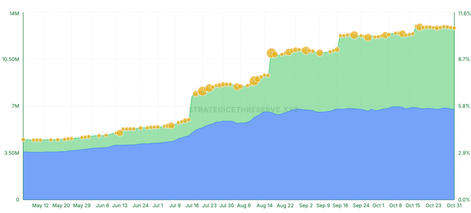 A StrategicETHreserve.xyz adatai azt mutatják, hogy a stratégiai tartalékok és ETF-ek együttes állománya október 16. óta 124 060 ETH-val csökkent.