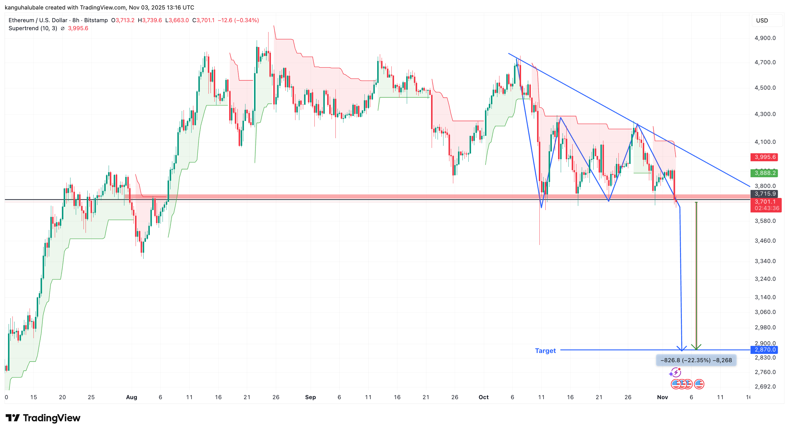 A Pillows szerint az ETH ára egy „kulcsfontosságú támaszzónában” van 3700 dollár körül, hozzátéve, hogy mélyebb esés is lehetséges 3500 dollárra, ha a 4000 dollárt nem sikerül gyorsan visszaszerezni.