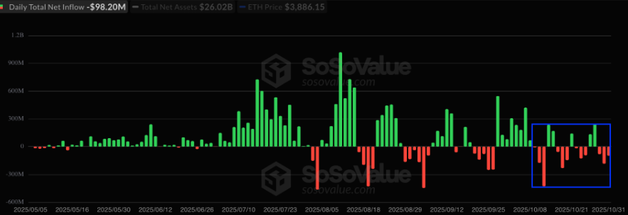 Az Ether árfolyamának csökkenése a befektetők kockázatcsökkentési magatartásának tulajdonítható, ami a spot Ethereum tőzsdén kereskedett alapjaiban (ETF-ek) is látható. A kereskedők az elmúlt két hétben tőkét vontak ki ezekből a befektetési termékekből.