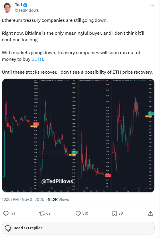 „Az Ethereum treasury cégek árfolyama továbbra is csökken”, a BitMine az egyetlen érdemi vevő – emelte ki Ted Pillows elemző egy hétfői X bejegyzésben, hozzátéve: „Nem hiszem, hogy ez sokáig folytatódik.”