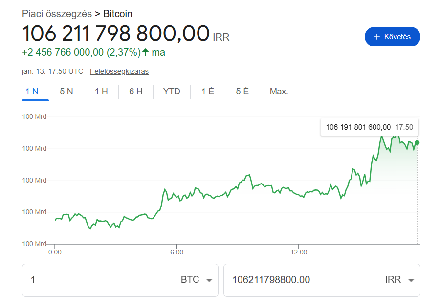 Mert bár a forint sem egy erős valuta, a cikk írásakori árfolyamon olyan 30 millió forintért lehet egy BTC-t venni. Viszont már az iráni tüntetések kirobbanásakor, december 28-án közel 4 milliárd riált kellett adni egy Bitcoinért és azóta csak romlott a helyzet. Gondoljunk bele, január 13-án egyetlen dollárért már 1,5 millió riált kell adni a szabadpiacon. Nehéz pontos adatokat gyűjteni a folyamatosan változó helyzetben, de már minden árfolyamszolgáltató 1 millió riál fölé lövi be az aktuális árat. Éves távlatban nem is érdemes nézni az árfolyamgrafikont, mert a hosszú egyenes után december végén kilőtt a magasba a dollárhoz és a Bitcoinhoz viszonyított riál ár. Azt is mondhatjuk, hogy megszületett a Bitcoin omega gyertya.