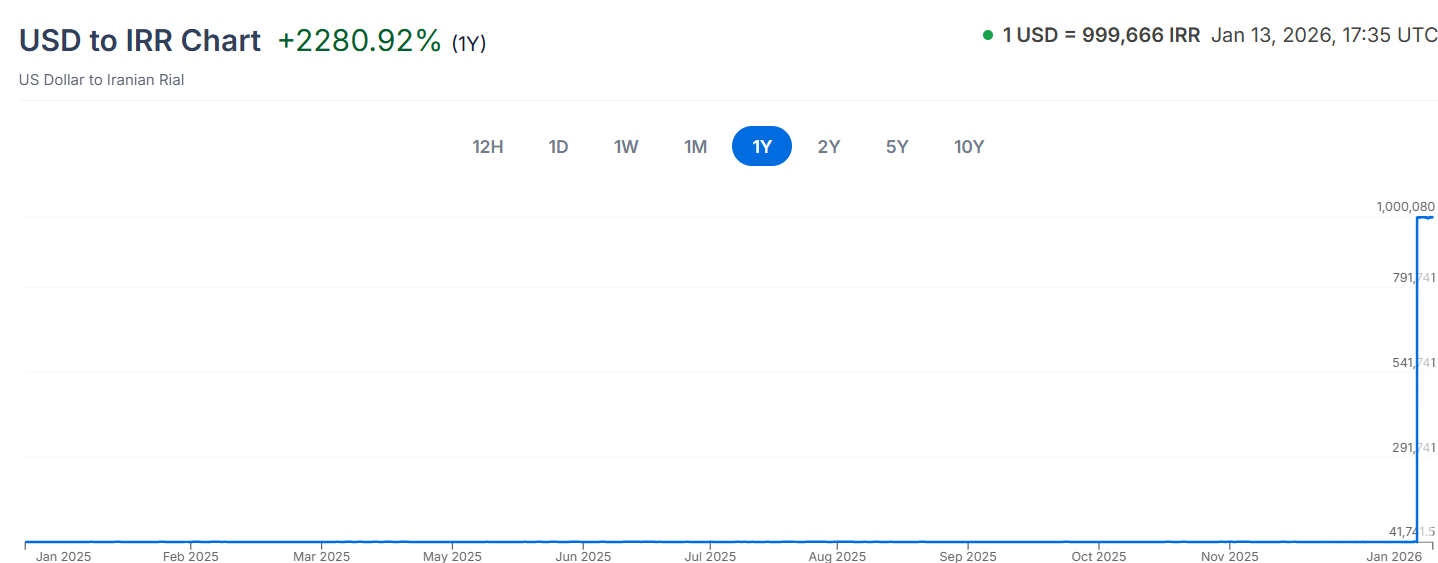 Az ENSZ szeptemberben újra bevezetett szankciói tovább gyorsították a gazdasági összeomlást. De emellett több más tényező is hozzájárult a riál bedőléséhez. Az iráni gazdaság gyengesége, az infláció mértéke, és az amerikai „maximális nyomás” politika is nagyon komoly hatással volt a fiat pénz erejére. A mostani bedőlés egy újabb éles értékvesztés évét követte, mert csak 2025-ben a riál önmagában mintegy 45%-ot veszített értékéből, folyamatosan aláásva ezzel a vásárlóerőt, a megtakarításokat és a bizalmat a hazai pénzügyi rendszerben. Az éves infláció decemberben elérte a 42,2%-ot a hivatalos adatok szerint, ami a világ egyik legmagasabb inflációs rátája. De amit most láthatunk a riál árfolyamgrafikonján, az valószínűleg a teljes összeomlás.