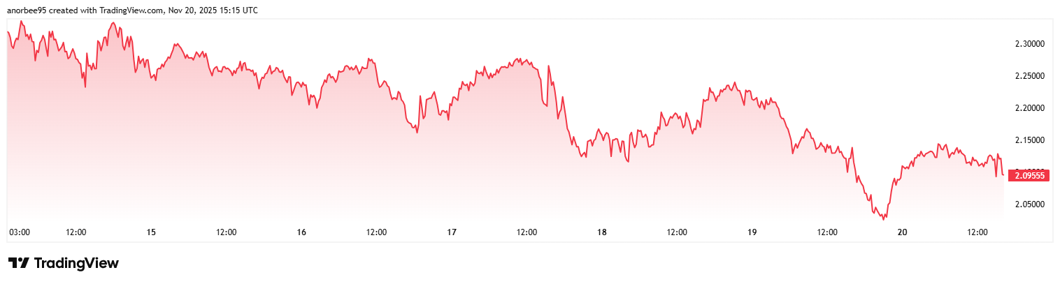 Az XRP árfolyamának alakulása 2025. november 20. körül (forrás: TradingView)Az XRP árfolyama az elmúlt napokban 2,05 és 2,30 dollár között mozgott, enyhén csökkenő tendenciával és fokozott napi volatilitással. Ez jól mutatja, hogy bár a hálózat bevételei alacsonyak, az árfolyam továbbra is aktív, a piaci szereplők pedig figyelik minden, a hálózatot érintő hírt.