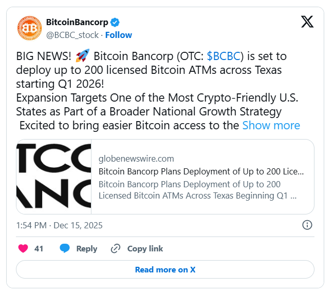 Texas szerepe az Egyesült Államok kriptotérképén tovább fog bővülni, miután a Bitcoin Bancorp bejelentette, hogy 2026 első negyedévétől kezdődően akár 200 Bitcoin ATM-et is üzembe helyez az államban. A szövetségi állam tovább bővíti a már így is sűrű kripto ATM hálózatát, amely az ország egyik legegyértelműbb szabályozási keretei között működik.