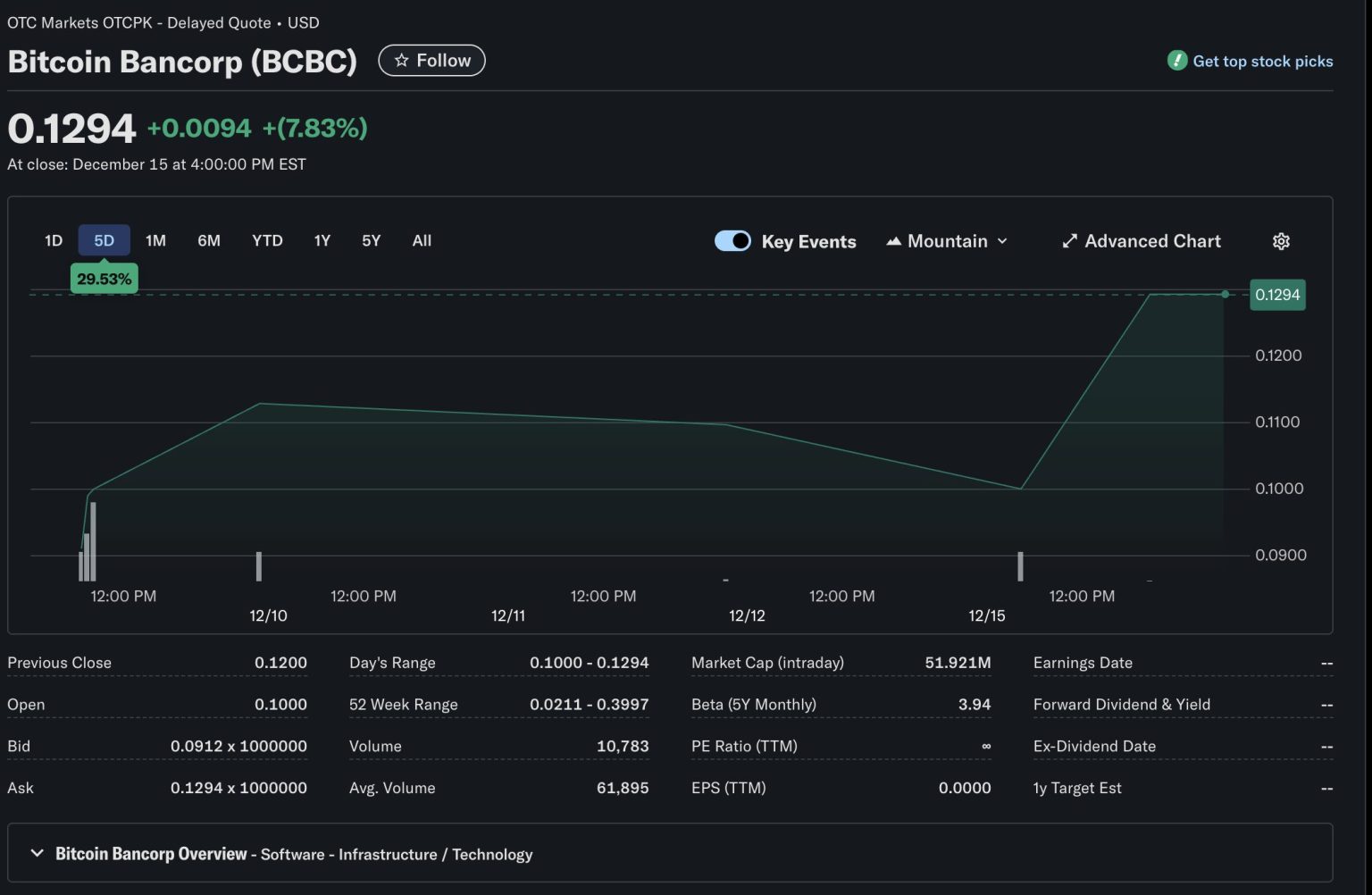 A bejelentést követően a Bitcoin Bancorp részvényei 7,83%-kal emelkedtek aznap, és 29,53%-kal nőttek az elmúlt öt napban, ami tükrözi a befektetők megnövekedett bizalmát az expanziós stratégiában.