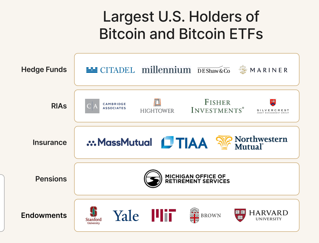 A Wells Fargo, a Bank of America és a Vanguard is megnyitotta a Bitcoin ETF forgalmazását ügyfelei számára idén – ami azt jelenti, hogy több tízezer vagyonkezelő most először ajánlja aktívan a bitcoinban való kitettséget. A Goldman Sachs szerint az intézményi befektetők 71%-a tervezi, hogy növeli kriptovalutákkal való befektetését a következő 12 hónapban.