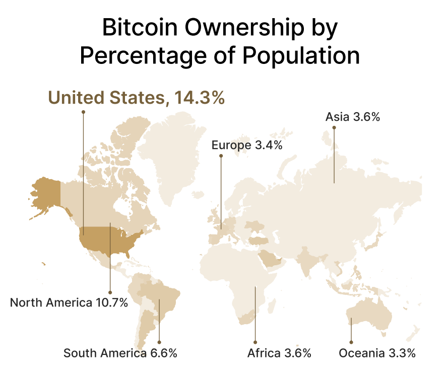 Az Egyesült Államok nemcsak az egyének szintjén a vezet a bitcoin tulajdonlásban. Az amerikaiak a teljes globális bitcoinkészlet 40%-át birtokolják – többet, mint bármely más ország. Az amerikai tőzsdén kereskedett vállalatok a világ összes vállalati bitcoinkészletének 94,8%-át teszik ki. Maga az amerikai kormány körülbelül 198 000 BTC-t birtokol, ami a globálisan kormányzati tulajdonban lévő bitcoin 65%-át teszi ki. Az Egyesült Államok rendelkezik a világ legnagyobb nemzeti aranytartalékával, 8133 tonnával.