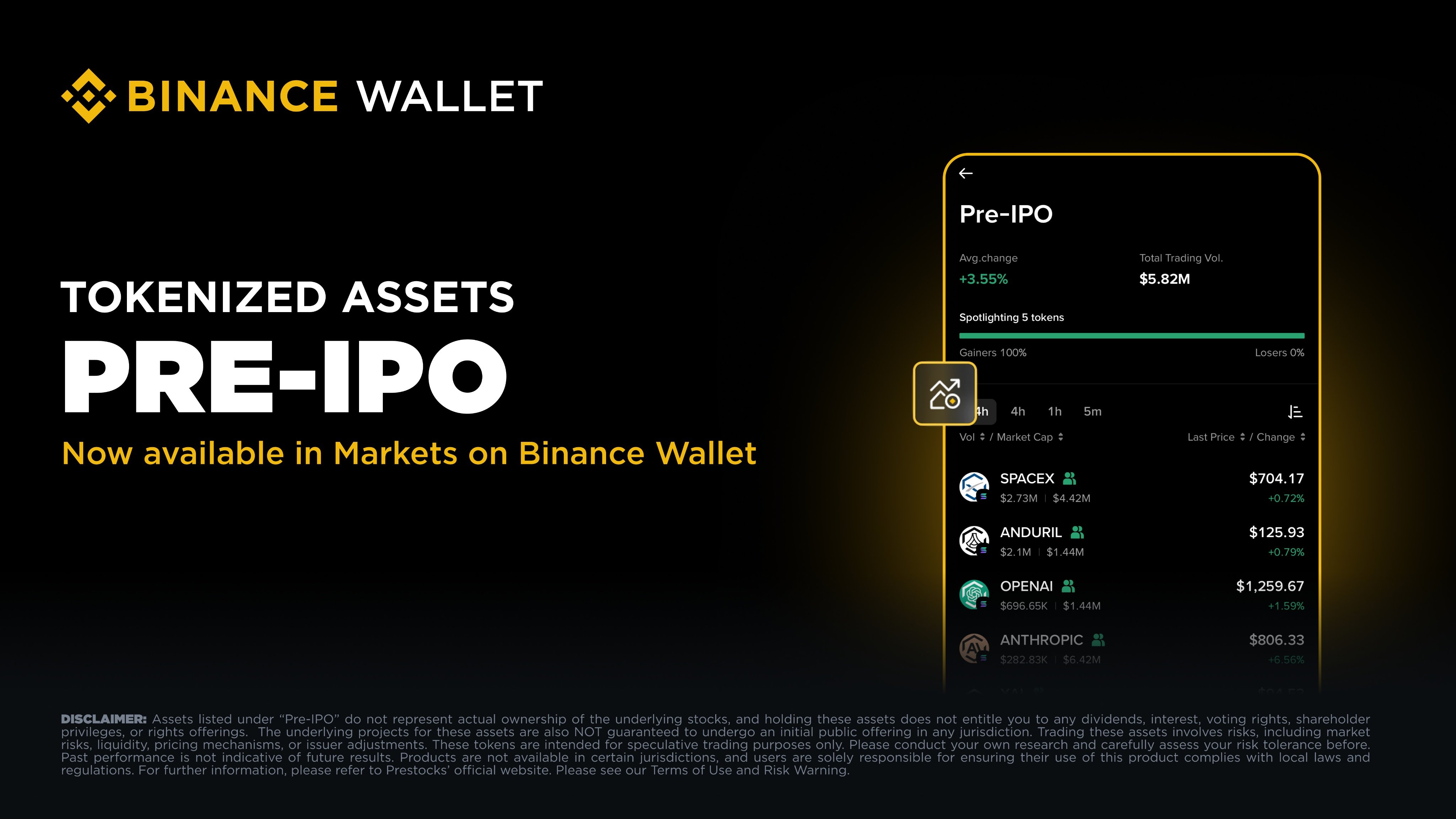 Az első tételek között 5 tokenizált eszköz található meg, amelyeket a Binance hivatalos promóciós képekkel emel ki. Itt olyan technológiai vezető cégek szerepelnek, mint a SpaceX és az OpenAI. Ez is mutatja, hogy a korai hozzáférés a nagy presztízsű cégekre összpontosul, amelyeket jellemzően csak a kockázati tőke- és magántőke befektetők érhetnek el.
