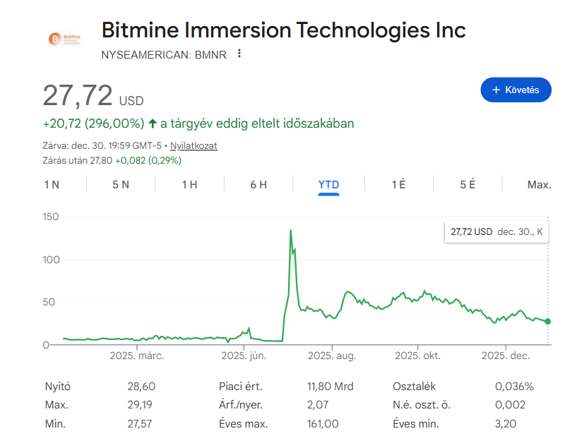 A vállalat generálta hype-ot az is erősítette, hogy Tom Lee mellett Peter Thiel is feltűnt, aki az egyik legismertebb bitcoin-maximalista vállalkozó. Együttesük klasszikus FOMO-hatást generált: a BitMine részvényárfolyama 2025 júniusában 4,4 dollárról egészen 135 dollárig emelkedett, majd év végére 28 dollár körül talált támaszt.