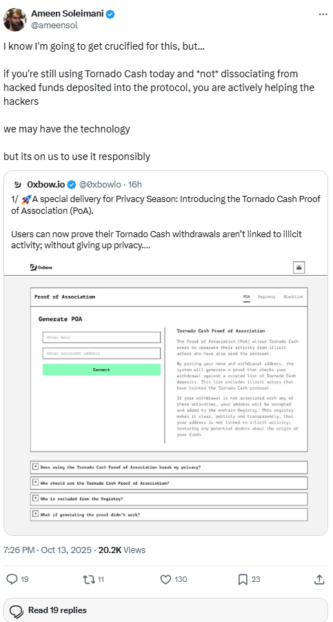 „Ha ma is használod a Tornado Cash-t, és *nem* határolódsz el a protokollba befizetett feltört pénzeszközöktől, akkor aktívan segíted a hackereket”. – mondta Ameen Soleimani, az 0xbow társalapítója az X-en. „Ha rendelkezünk a technológiával, akkor rajtunk múlik, hogy felelősségteljesen használjuk-e.”