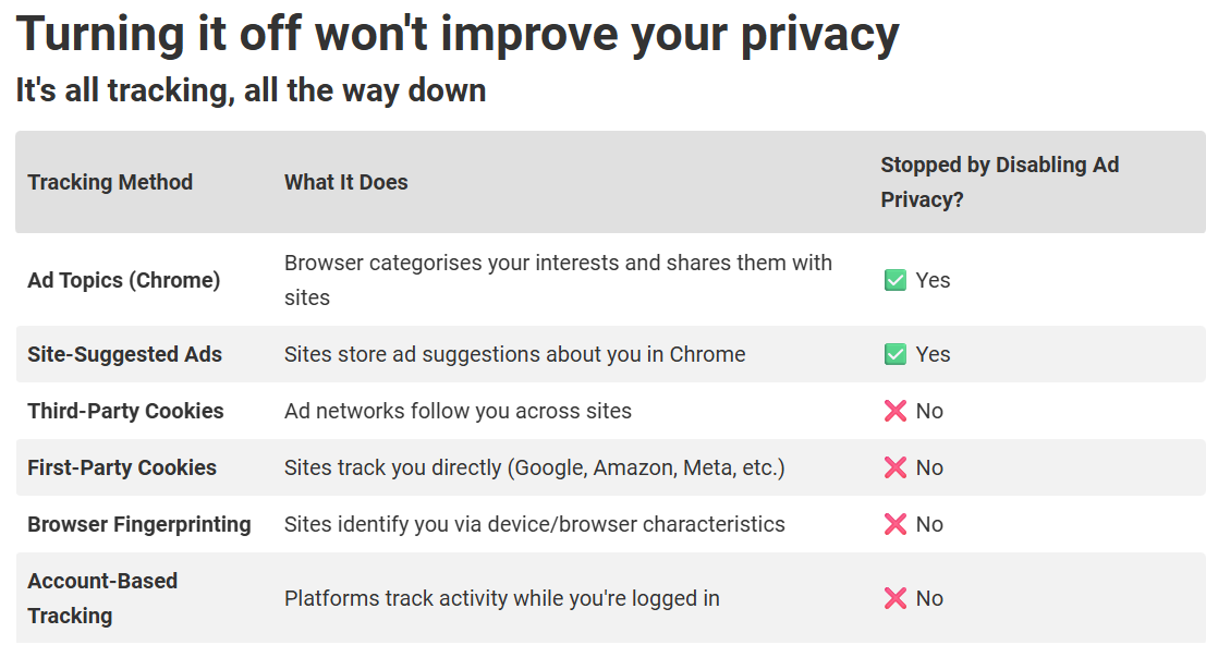 Nem meglepő módon a funkció csak a felszínen tűnik adatvédelemnek, mert az Ad Privacy nem váltotta ki a sütiket, egyszerűen egy újabb követési réteg lett a meglévők mellé, még inkább rámutatva, hogy a Google milyen ütemben és mennyiségben gyűjt adatokat. A Privacy Sandbox programot hivatalosan 2025 októberében leállították és a Google visszatért a harmadik feles cookie-khoz, de az Ad Privacy beállítások továbbra is aktívak a Chrome-ban, és alapértelmezetten be is vannak kapcsolva. Három fő elemből áll.