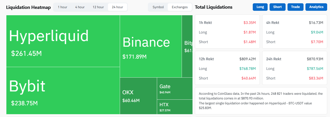 Az esést súlyosbította, hogy januárban még nem volt ehhez hasonló kitisztulás a piacon, így az elmúlt 24 órában 787 millió dollár értékű long (vételi) pozíciók kerültek automatikusan bezárásra a dominóhatás miatt. Ez 250 ezer kereskedőt érint, a legnagyobb érintett platformok pedig a Hyperliquid (261 millió dollár), a Bybit (238 millió dollár) és a Binance (172 millió dollár).