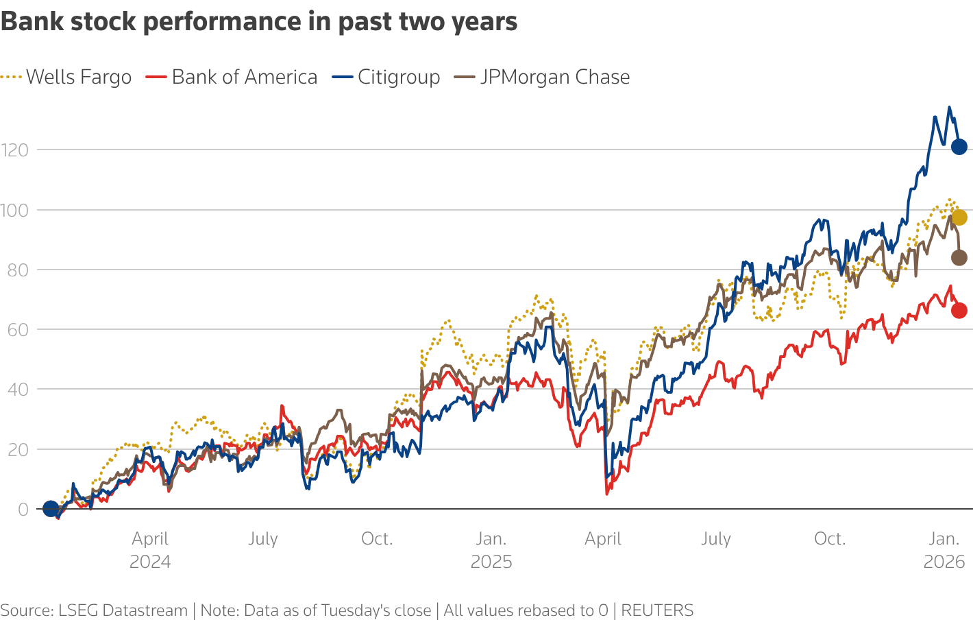 Legnagyobb amerikai bankok részvényeinek teljesítménye az elmúlt két évben | LSEG Datastream