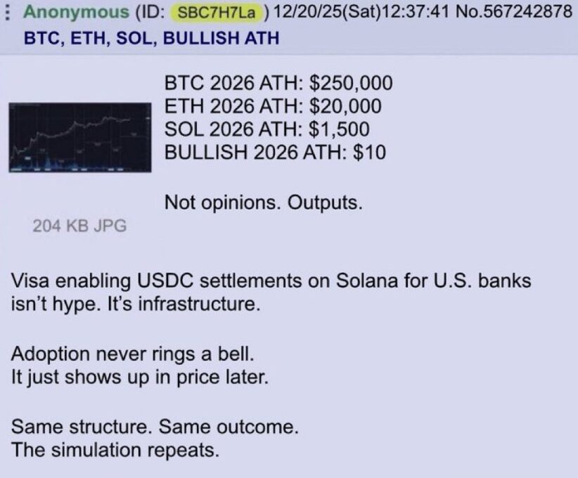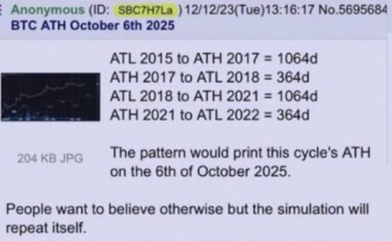 A teljesen anonim módon történő posztolást lehetővé tevő 4chan egyik névtelen felhasználója, aki nagyjából két évvel ezelőtt helyesen jelezte előre 2025. október 6-ára a Bitcoin ciklusának csúcspontját, most egy sokkal agresszívebb előrejelzéssel tért vissza. A kereskedő szerint a Bitcoin árfolyama 2026-ban eléri a 250000 dolláros értéket. Az előrejelzés pont akkor bukkant fel és kezdett el terjedni a közösségi oldalakon, amikor számos on-chain és technikai mutató lefelé forduló irányt mutat. 2023 decemberében a névtelen posztoló inkább egy időalapú ciklusmodellt vázolt fel, mint árjóslatot. A tézise a történelmi szimmetrián alapult: