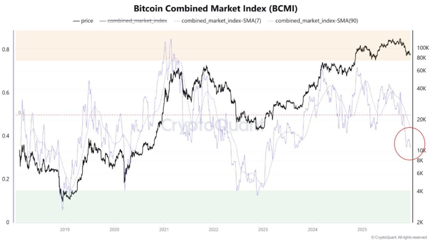 A legutóbbi bejegyzésében a névtelen jós azt állítja, hogy a tágabb struktúra nem tört meg. Ebben az értelmezésben a jelenlegi visszaesés egy újabb bővülési szakasz előtti visszahúzódási fázist jelent csak, amelynek következő csúcspontja 2026-ra tehető. A rövidtávú adatok mindenesetre egészen más képet mutatnak. A Bitcoin Combined Market Index (BCMI) visszaesett a korábban magas szintekről, amelyek történelmileg a ciklus késői szakaszához kapcsolódnak. A BCMI a Bitcoin piac egészségi állapotát méri, és több mutatót kombinál, úgy mint a piaci érték és a realizált érték aránya, a befektetők átlagos nyereség-veszteség állapota vagy éppen a piaci hangulat mérőszáma. A magas BCMI értékek gyakran túlzott optimizmust és késői ciklust jeleznek, míg az alacsony értékek inkább alulértékeltséget vagy ciklusok kezdetét.