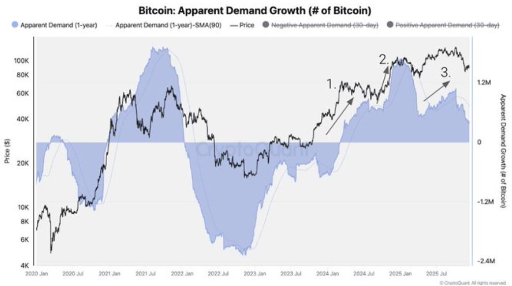 Hasonló keresletlassulások előzték meg a nagyobb korrekciókat a korábbi ciklusokban, például 2021-ben és 2017-ben. Az anonim előrejelző viszont megkérdőjelezi azt az elképzelést, hogy a medvepiaci jelek határozzák meg a teljes ciklust. A korábbi bikapiacok idején is több hónapos korrekciókat és keresleti visszaeséseket lehetett tapasztalni, aztán kilőtt az ár.