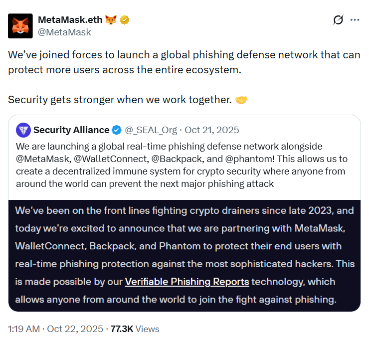 A főbb tárcaszolgáltatók, mint a MetaMask, a Phantom, a WalletConnect és a Backpack, a Security Alliance (SEAL) partnerségével globális adathalász-védelmi hálózatot hoztak létre, amelynek segítségével valós időben azonosíthatók a fenyegetések.