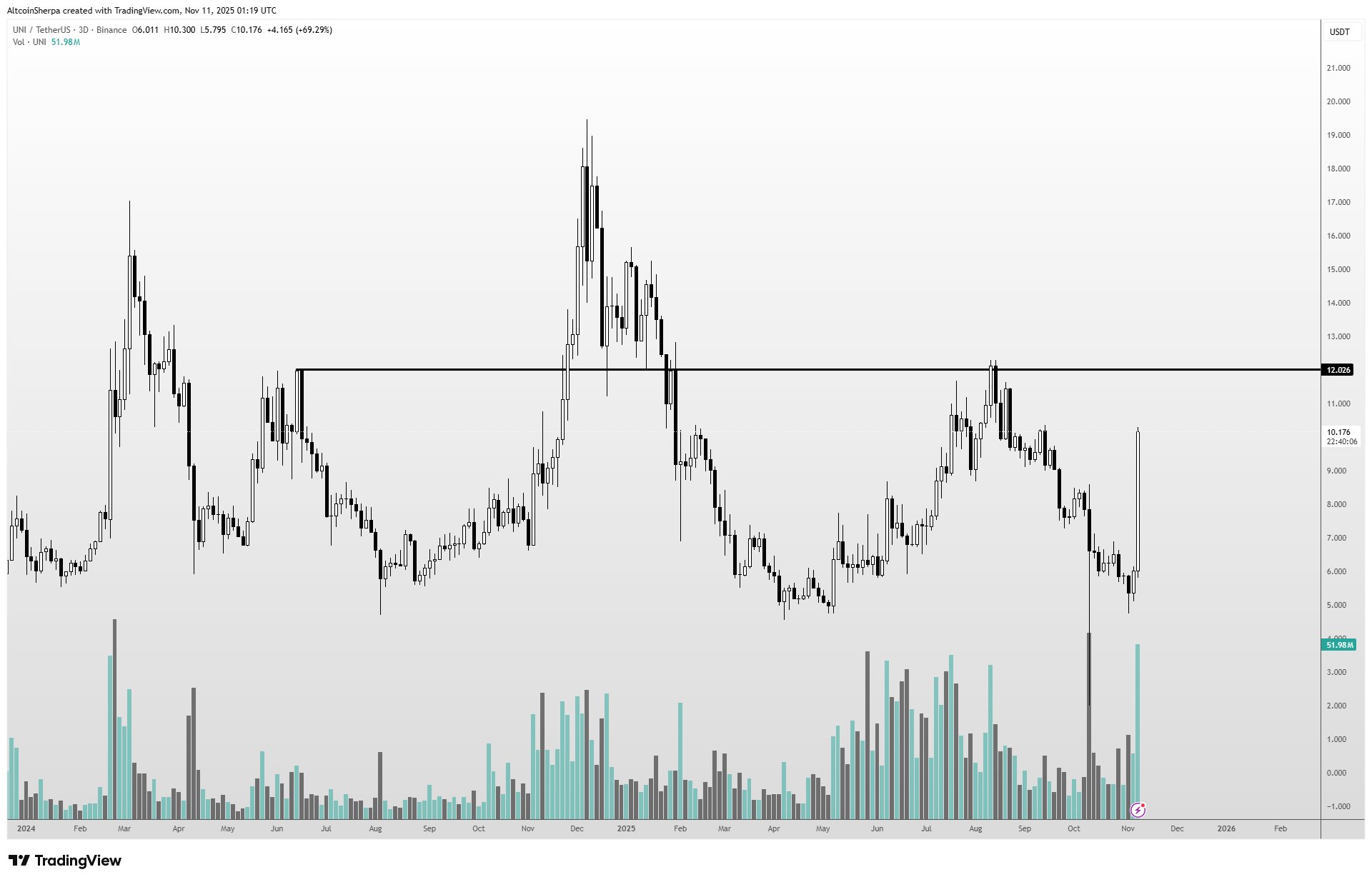 Az Uniswap az Ethereum-alapú decentralizált tőzsdék (DEX-ek) úttörője, amely 2018-as indulása óta forradalmasította a blokklánc-alapú tokenkereskedelmet. A UNI 2020-as bevezetése óta a platform egyre nagyobb szerepet kap a decentralizált pénzügyi ökoszisztémában, bár az árfolyam az elmúlt években jelentős hullámzást mutatott – 2021-es csúcsokról indulva 2022–2025 között egy hosszabb konszolidációs, helyenként lejtmenetes időszakot láthattunk. Most azonban egy rendkívüli irányváltás adhat újra lendületet.