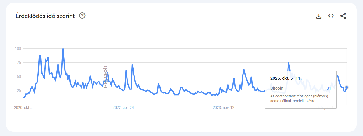 Az olyan cégek, mint a Marathon Digital vagy a CleanSpark, nem realizálnak profitot, inkább halmoznak, ezzel tovább szűkítve a likvid kínálatot. A Google Trends adatai alapján a bitcoin iránti online keresési érdeklődés pedig jóval alacsonyabb, mint a 2021-es ciklus csúcsán – a 2025. október 5-11. közötti időszakban az érdeklődés mértéke csak „32”-es pontszámot ért el a 100-as maximumhoz képest (forrás: Google Trends).