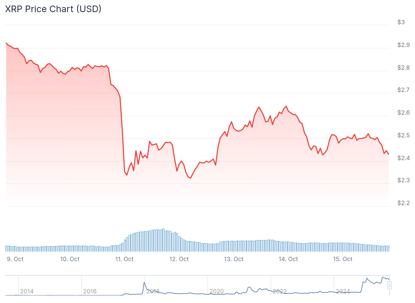 Az október elején bekövetkezett meredek visszaesés után, amely jelentősen csökkentette a rövid távú nyereséget, az eszköz továbbra is a kulcsfontosságú mozgóátlagok alatt ragadt. Az XRP jelenleg körülbelül 2,40 dolláron kereskedik, és nehezen tud kilábalni a 200 napos EMA-ból, amely most 2,80–2,90 dollár közötti ellenállássá vált.