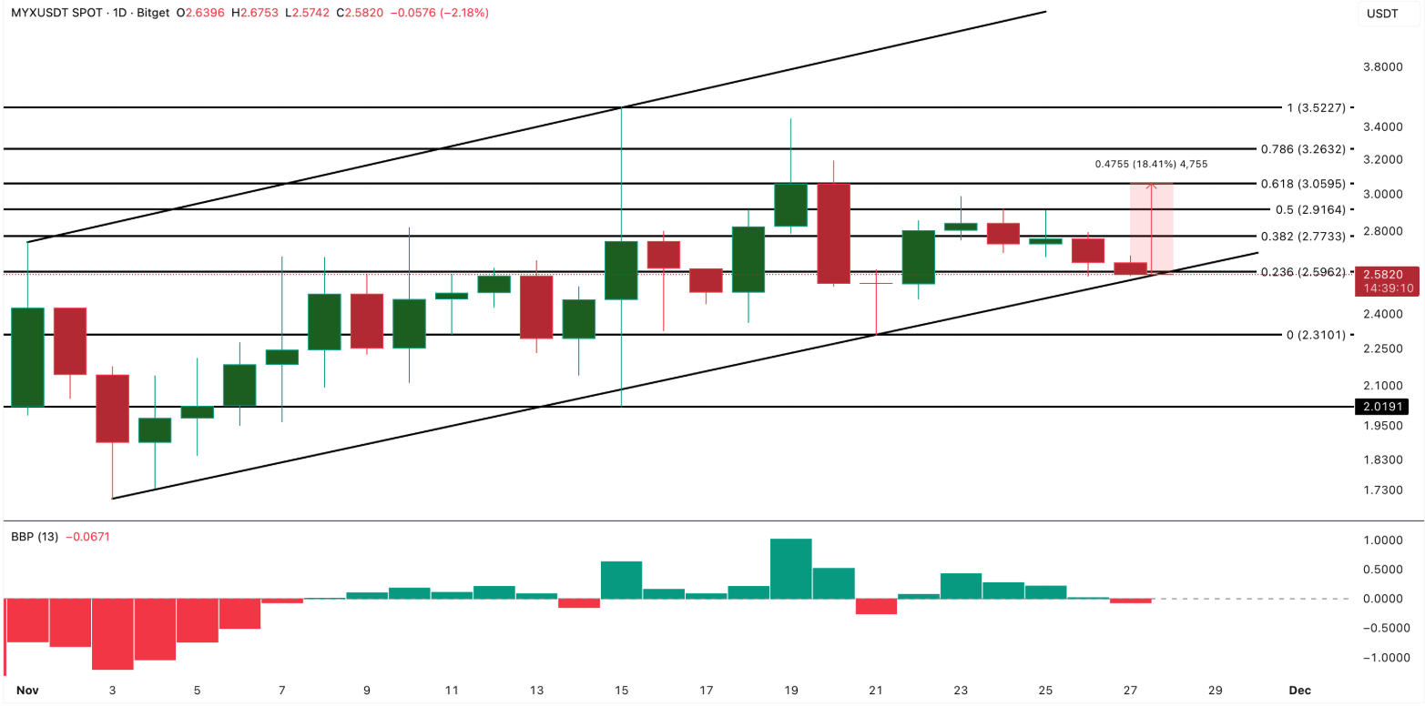 Három hónap alatt még mindig több mint 105%-os növekedést mutat. Jelenleg spot kereskedésre elérhető a Bitget és a Gate platformokon. A napi grafikon azt mutatja, hogy a MYX egy emelkedő csatornában van, amely november eleje óta tart. Az alsó trendvonal többször is megérintette, és továbbra is az erősebb sáv. Ha az ár 3,05 dollár fölé tudna emelkedni, ami egybeesik a 0,618 Fibonacci szinttel, a MYX megkísérelheti a csatorna felső részébe való emelkedést.