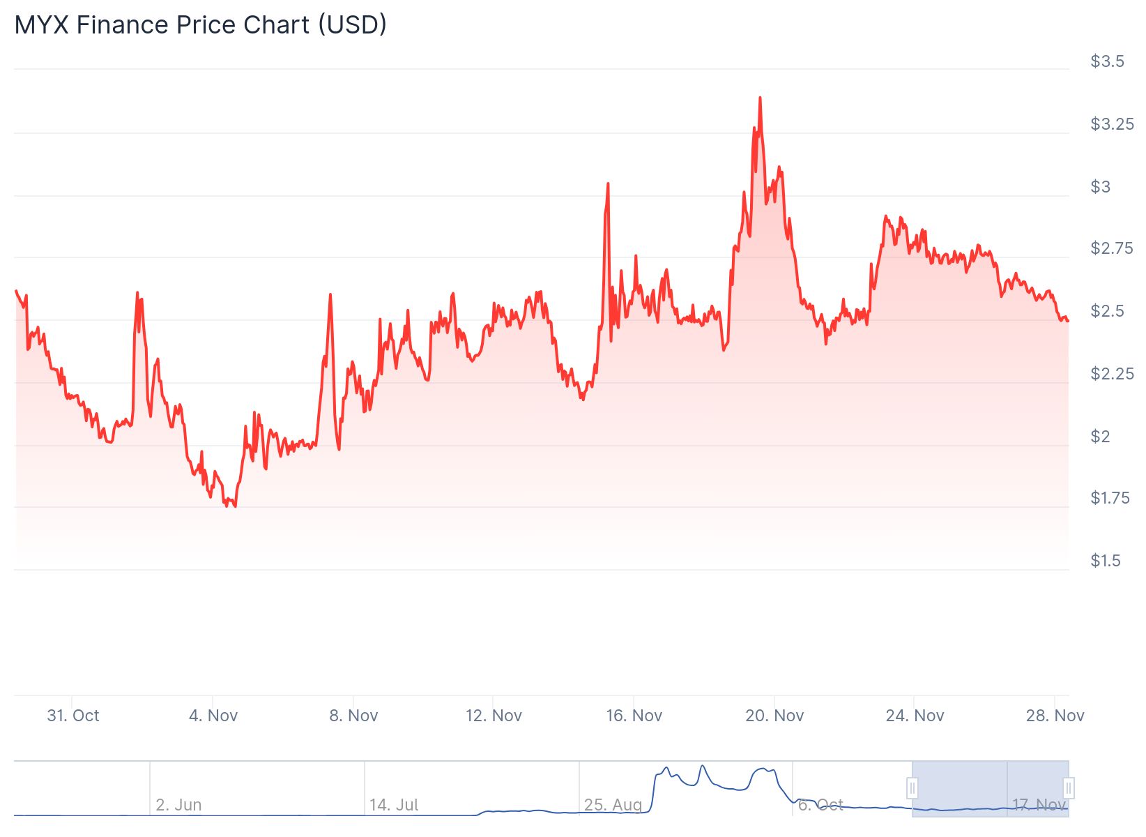 Nagyon jó esélyei vannak egy Binance-listázásra az MYX Finance decentralizált tőzsdei projekt coinjának is. A Binance Alpha listájának élcsoportjában helyezkedik el, az egyik legmagasabb piaci kapitalizációval rendelkezik, amely körülbelül 551 millió dollár a cikk írásakor, és az elmúlt hónapban produkált körülbelül 4,6%-os csökkenés ellenére is megőrizte a a centralizált tőzsdei bevezetéséből származó nyereségének jelentős részét.