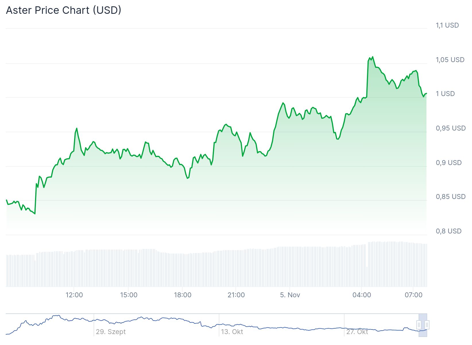 Az ár aktuálisan 1,01 amerikai dollár, ami azért jelentősen elmarad a 2,41 dolláros árfolyamcsúcsától (október egyik legnagyobb vesztese volt a coin). Egyébként nagyon nem kell semmi extrát belelátni az Aster teljesítményébe, leginkább CZ kitartó támogatása az, ami hajtja előre a coint. Az Aster technikai indikátorai jelenleg eladási jelzést mutatnak. Mind az egyszerű (SMA), mind az exponenciális mozgóátlagok (EMA) 10, 20 és 30 napos időtávon a jelenlegi ár alatt helyezkednek el, ami gyenge rövid távú trendet jelez. Ez arra utalhat, hogy a közelmúltbeli árfolyam-emelkedés ellenére a technikai elemzés alapján még nem alakult ki stabil vételi momentum.
